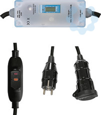 Mobiler Wechselstromzähler mit Schutzkontaktstecker und Schutzkontaktkupplung. Für Innen- und Außenbereich geeignet. Maximalstrom 16 A. Stand-by-Verlust nur 0,4 Watt.