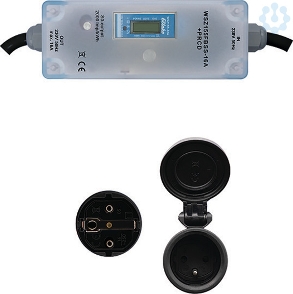 Schutzart Gehäuse: IP68, Schutzart Stecker/Kupplung: IP54. Gehäuse-Abmessungen 155 x 60 x 82 mm, Anschlussleitung 1,5 m (incl. Stecker und Kupplung). Genauigkeitsklasse B (1%). Dieser mobile Wechselstromzähler misst die Wirkenergie anhand des zwischen dem Eingang und dem Ausgang fließenden Stromes. Der Eigenverbrauch von nur maximal 0,4 Watt Wirkleistung wird nicht gemessen und nicht angezeigt. Zyklisch wechselt die Anzeige auf dem Display alle 10 Sekunden zwischen der aufgelaufenen Wirkenergie in kWh und dem Momentanverbrauch in kW. Der Anlaufstrom ist 20 mA. Das Display kann nur mit Stromversorgung abgelesen werden. Der Verbrauch ist jedoch nichtflüchtig gespeichert und wird nach einem Stromausfall sofort wieder angezeigt. Die Digitalanzeige hat 7 Stellen. Bis 99999,99 kWh werden zwei Nachkommastellen angezeigt, ab 100000,0 kWh nur noch eine. Der mobile Wechselstromzähler ist mit einem Haltebügel für eine einfache Montage ausgestattet. Dieser kann, falls nicht notwendig, einfach entfernt werden. Der Leistungsbezug wird mit einer 2000-mal je kWh blinkenden LED angezeigt.