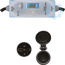 Mobiler Wechselstromzähler mit Schutzkontaktstecker und Schutzkontaktkupplung. Für Innen- und Außenbereich geeignet. Maximalstrom 16 A. Stand-by-Verlust nur 0,4 Watt.