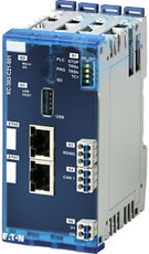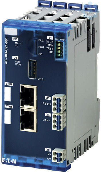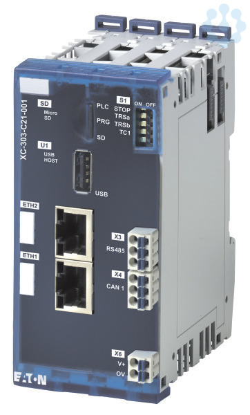 Mit der XC-303 bietet Eaton eine leistungsstarke und flexible Steuerung, die es Maschinen- und Anlagenbauern erlaubt, in Kombination mit dem kompakten I/O-System XN300 und dem innovativen Multi-Touchpanel XV300 ein schlankes und modernes Automatisierungskonzept zu realisieren. Ethernet-Schnittstellen zur Verbindung in unterschiedliche Netzwerke gepaart mit Standardschnittstellen CAN und RS485 erweitern die Funktionen der XC-303 zu einem universellen Daten- und Kommunikationspunkt der vernetzten Anlage. Die kommunikative Kleinsteuerung ist CODESYS 3 programmierbar, unterstützt die WEB Visualisierung im HTML5 Format und der OPC-UA Server gewährleistet den Datenaustausch in der Machine-to-Machine(M2M)-Kommunikation. Bis zu 32 Module des XN300 I/O-Systems lassen sich als lokale I/O-Ebene anrasten. Folgende Schnittstellen sind in dieser Variante enthalten: USB, Micro SD, 2xEthernet, CAN und RS485.