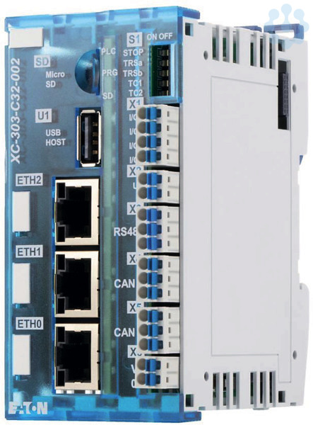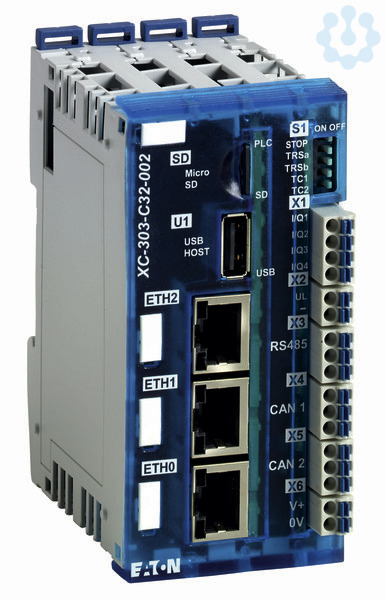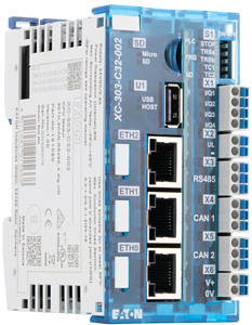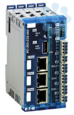 Mit der XC-303 bietet Eaton eine leistungsstarke und flexible Steuerung, die es Maschinen- und Anlagenbauern erlaubt, in Kombination mit dem kompakten I/O-System XN300 und dem innovativen Multi-Touchpanel XV300 ein schlankes und modernes Automatisierungskonzept zu realisieren. Ethernet-Schnittstellen zur Verbindung in unterschiedliche Netzwerke gepaart mit Standardschnittstellen CAN und RS485 erweitern die Funktionen der XC-303 zu einem universellen Daten- und Kommunikationspunkt der vernetzten Anlage. Die kommunikative Kleinsteuerung ist CODESYS 3 programmierbar, unterstützt die WEB Visualisierung im HTML5 Format und der OPC-UA Server gewährleistet den Datenaustausch in der Machine-to-Machine(M2M)-Kommunikation. Bis zu 32 Module des XN300 I/O-Systems lassen sich als lokale I/O-Ebene anrasten. Folgende Schnittstellen sind in dieser Variante enthalten: USB, Micro SD, 3xEthernet, 2xCAN und RS485 sowie 4 x digitale Ein/Ausgänge