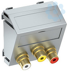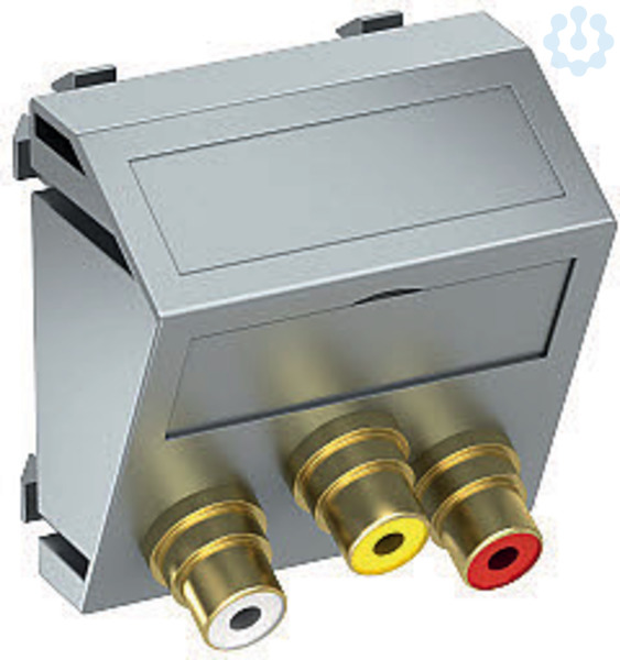 Multimediaträger mit drei Cinch Anschlussbuchsen für Audio-Video, Kabelauslass schräg, mit Beschriftungsfeld, drei Cinch Buchsen (RCA) mit Lötanschluss, Farbkodierung gelb/rot/weiß. Trägerplatte mit Rastbefestigung, geeignet für den waagerechten und senkrechten Einbau in die Systemumgebung.