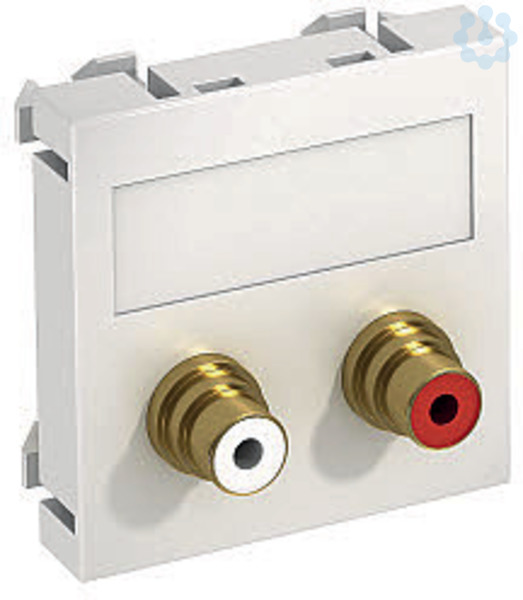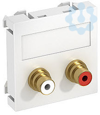 Multimediaträger mit zwei Cinch-Anschlussbuchsen für Audio R/L, Kabelauslass gerade, mit Beschriftungsfeld, zwei Cinch-Kupplungen (RCA) in Ausführung Buchse-Buchse, Farbkodierung rot/weiß. Trägerplatte mit Rastbefestigung, geeignet für den waagerechten und senkrechten Einbau in die Systemumgebung.