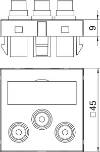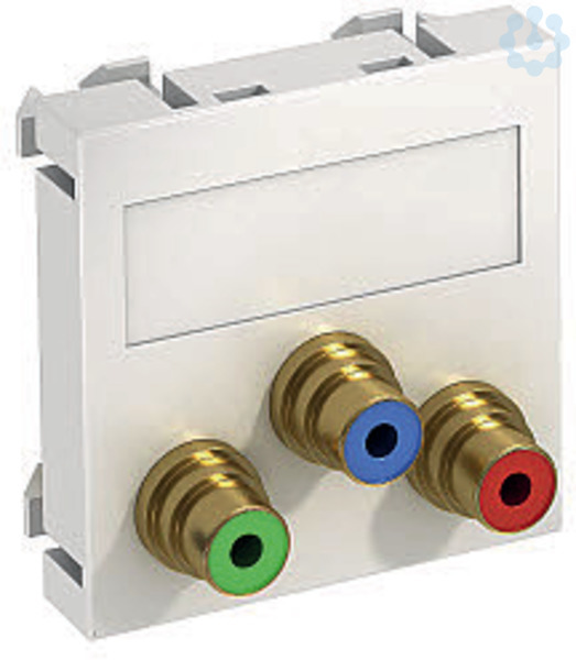 Multimediaträger mit drei Cinch-Anschlussbuchsen für Component Video, Kabelauslass gerade, mit Beschriftungsfeld, drei Cinch-Kupplungen (RCA) in Ausführung Buchse-Buchse, Farbkodierung rot/grün/blau. Trägerplatte mit Rastbefestigung, geeignet für den waagerechten und senkrechten Einbau in die Systemumgebung.