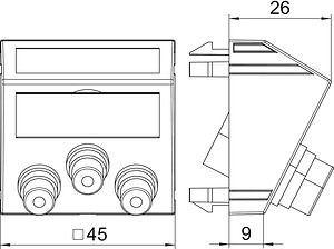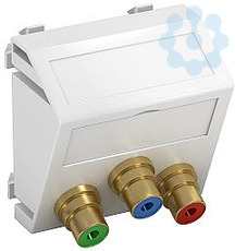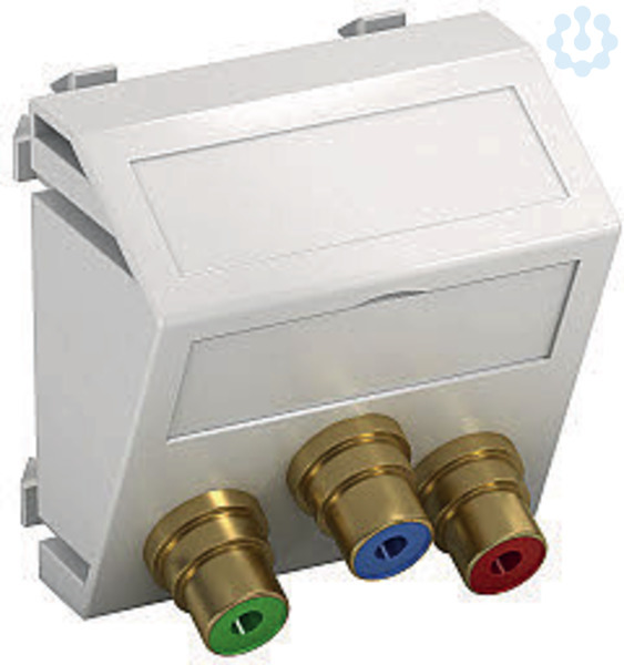 Multimediaträger mit drei Cinch-Anschlussbuchsen für Component Video, Kabelauslass schräg, mit Beschriftungsfeld, drei Cinch-Kupplungen (RCA) in Ausführung Buchse-Buchse, Farbkodierung rot/grün/-blau. Trägerplatte mit Rastbefestigung, geeignet für den waagerechten und senkrechten Einbau in die Systemumgebung.