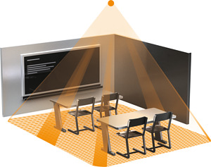 Die Quadratur des Kreises. Infrarot-Präsenzmelder Presence Control PRO IR Quattro KNX für innen, ideal für kleine Büros, Abstell-, Versorgungs- und Hauswirtschaftsräume, Waschräume und WCs, Montagehöhe bis 8 m, mit digitaler BUS-Schnittstelle zum Regeln von 4 Lichtkanälen und HLK, 1760 Schaltzonen für exzellente Erfassungsqualität, quadratische Erfassung mit 16 m² Präsenzbereich, quadratische Erfassung, mechanisch skalierbar.