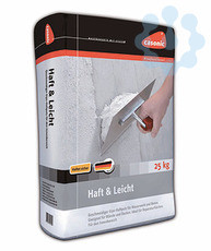 Haftputzgips Rot-Weiss, einlagiger Innenputz mit Haftzusätzen und hoher Ergiebigkeit für die Handverarbeitung auf allen üblichen Putzuntergründen sowie auf rauen oder glatten Betonflächen im Innenbereich einschließlich häuslicher Küchen und Bäder, bei glatten Untergründen ist eine Vorbehandlung mit Betokontakt erforderlich, geglättet, gefilzt oder in freier Struktur verarbeitbar, Verarbeitungszeit ca. 60 Minuten (je Verarbeitungsbedingungen), empfohlene Putzdicke 8mm, Materialverbrauch ca. 5qm / 30 kg-Sack bei 8mm Putzdicke, Lagerfähigkeit ca. 3 Monate, im Papiersack 30 kg