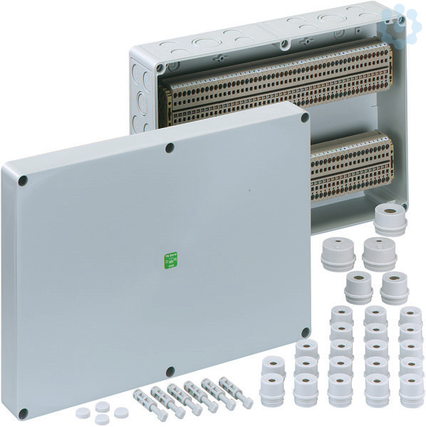 Reihenklemmengehäuse, mit Schutzart IP54/IP66, Nennquerschnitt 4mm², Ui=400V AC, Polystyrol, innenliegende Befestigungsstellen, für Standardinstallationen im Innenbereich, bestückt mit 100 schraubenlosen Klemmen 4mm² (Typ Weidmüller ZDU 4)