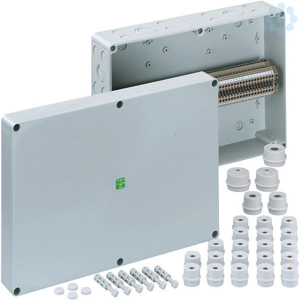 Reihenklemmengehäuse, mit Schutzart IP54/IP66, Nennquerschnitt 4mm², Ui=400V AC, Polystyrol, innenliegende Befestigungsstellen, für Standardinstallationen im Innenbereich, bestückt mit 50 Schraubklemmen 4mm² (Typ Weidmüller WDU 4)