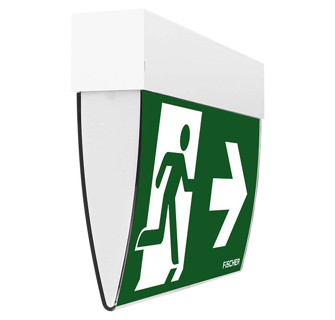 Haubenleuchte für die Rettungswegkennzeichnung mit universellem Piktogramm-Set. Das Gehäuse eignet sich zur Wand- oder Deckenmontage und ist aus Kunststoff gefertigt. Die selbstversorgte Notleuchte besitzt ein LED-Leuchtmittel. Die Betriebsbemessungsdauer ist über einen Schalter auswählbar (3h / 8h). Die Notleuchte ist mit einem Überwachungsmodul für automatische Funktions- und Betriebsdauertests ausgestattet, um einen Betrieb nach DIN V VDE 0108-100-1 und DIN VDE 0711-400 zu gewährleisten. Die Statusanzeige (Betriebsbereit, Ladebetrieb, Batteriebetrieb, Akkufehler, LED/Elektronikfehler) erfolgt über eine zweifarbige Status LED. Kritische Fehler können über ein optionales, akustisches Signal gemeldet werden. Der integrierte Akkumulator enthält eine elektronische Ladeüberwachung und einen Tiefentladeschutz.