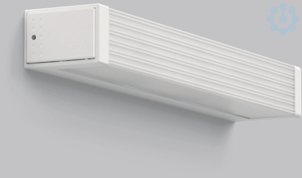 Linienleuchte als Wand- und Spiegelleuchte einsetzbar. Armatur Kunststoff. Endkappen Kunststoff. Mundgeblasenes Opalglas seidenglanz. Mit Druckschalter.