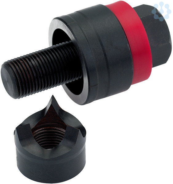 Schraublocher Diamant ein innovativer Spalt-Stempel mit drei Schneidspitzen: Stanzabfall wird in drei Teile gespalten. Geeignet für: Stahlblech (ST 37), Kunststoff und Aluminium. Betätigung: Manuell und hydraulisch. Ausführung: Mit Stempel und Matrize, Zugschraube mit Kugellager. Loch-Ø 37,0 mm; Materialstärke 3,0 mm; Nennmaß PG 29; Schraubengröße 19,0x55,0 mm; Vorbohr-Ø 20,4*mm