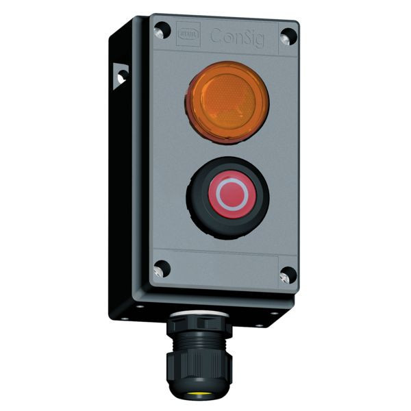 Befehlsgerätesystem, Reihe ConSig 8040, explosionsgeschützt, Typ : 8040/1280X-54C06SA70-01L08SA05, Bemessungsbetriebsspannung AC : 690 V, Bemessungsbetriebsstrom : 10 A, Gehäusematerial : Polyesterharz, Einsatzbereich (Zonen) : 1 , 2 , 21 , 22, Gasexplosionsschutz : II 2 G Ex db eb IIC T6 Gb, Staubexplosionsschutz : II 2 D Ex tb IIIC T80 °C Db, Umgebungstemperatur min. : -60 °C, Umgebungstemperatur max. : +40 °C, Schutzart (IP) : IP66, Einbauplatz oben : Leuchtmeldevorsatz, alle Farben, Einbauelement oben : LED Leuchtmelder, Einbauplatz unten : Drucktaster, rot - "0", Einbauelement unten : Kontaktelement, Schaltabwicklung unten : Öffner / Schließer, Leitungseinführung unten : 1 x M25 Ø 7 ... 17 mm, Flansche und Platten : ohne Flansche, ohne Platten, Für weitere Info siehe : r-stahl.com Webcode 8040B