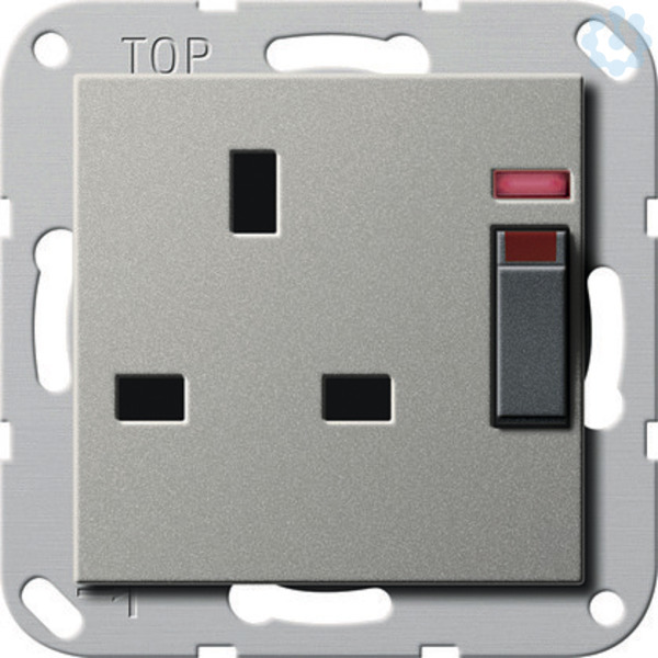 Steckdose British Standard (BS 1363-2) 13 A 250 V~ geschaltet, mit Kontrolllicht und Shutter Edelstahl (lackiert) Tragring 71 x 71 mm - Mit Schraubklemmen. - Nur für Schraubbefestigung.