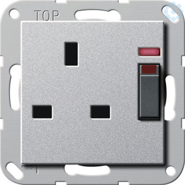 Steckdose British Standard (BS 1363-2) 13 A 250 V~ geschaltet, mit Kontrolllicht und Shutter Farbe Alu Tragring 71 x 71 mm - Mit Schraubklemmen. - Nur für Schraubbefestigung.