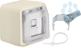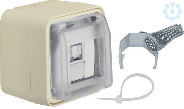 UAE Steckdose 8-polig geschirmt, Kat.6 AP W.1 polarweiß.UAE Steckdose 8-polig geschirmt mit Klappdeckel AP mit Beschriftungsfeld, Kat.6, IP55. Für Stecker RJ45, geeignet für PoE+, mit 2 Leitungseinführungen, mit Geradeauslass, mit 360° Schirmkontaktierung und Zugentlastung, mit LSA+ Klemmen, vollflächige Dichtung unter dem Gehäuseboden zur Abdichtung der Gehäuserückseite, mit transparentem, zufallendem Klappdeckel, manuell einrastbar, um den Schutzgrad IP55 zu erreichen, gut zugängliche, trichterförmige Montagelöcher in den Gehäusen, einfache Montage des Einsatzes im Rahmen mit Klappdeckel durch Einrasten, sichere Fixierung des Rahmens mit Klappdeckel am Gehäuse über Bajonett-Schnellverschluss.