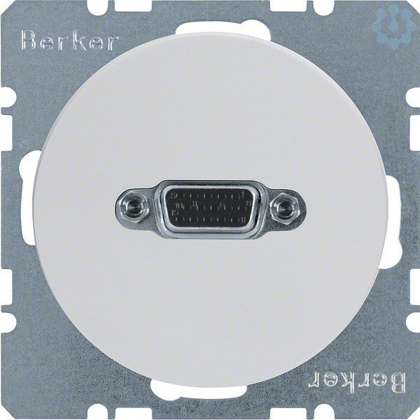 VGA Steckdose R.1/R.3 polarweiß, glänzend.VGA Steckdose geeignet zur Verbindung von z.B. PCs und Notebooks mit Anzeigegeräten, wie z.B. Monitoren (auch LCD-Monitoren) und Beamern, mit 15-poliger D-Subminiatur Doppelbuchse (vorder- und rückseitig), S-VGA kompatibel, ohne Spreizkrallen.
