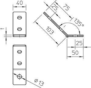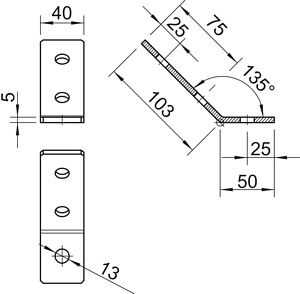 Montagewinkel mit 3 Löchern zur Verbindung von Profilschienen 41 x 41 mm und 41 x 21 mm im Winkel von 45°.