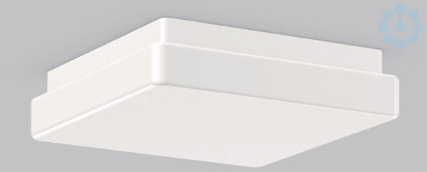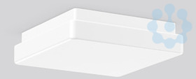 Flache quadratische Anbauleuchte. Armatur Kunststoff. Mundgeblasenes Opalglas seidenmatt. Glasbefestigung mit Federsystem. IP 43 Deckenmontage, IP 44 Wandmontage.