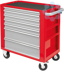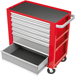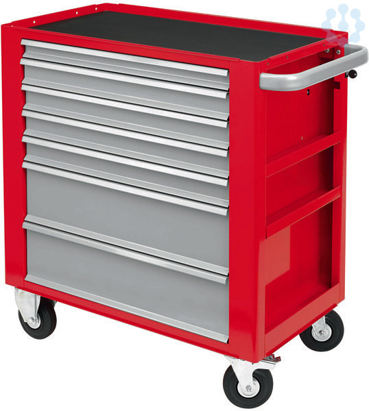 Werkstattwagen, leer, extrem robust und belastbar. Eine gerippte Gummimatte schützt die oberste Ebene. Mit Teleskopvollauszug und ölbeständige Gummiränder mit einem ø von 125 mm. 8 Seitenaufnahmen zur Aufbewahrung, mit insgesamt 7 Schubladen (Innenmaß 640x417 mm): 1 Schublade mit den Maßen: 665x 44x50 mm, 4 Schubladen mit den Maßen: 665x445x70 mm, 2 Schubladen mit den Maßen: 665x445x168 mm. Max. Traglast je Schublade: 30 kg/280 kg gesamt.