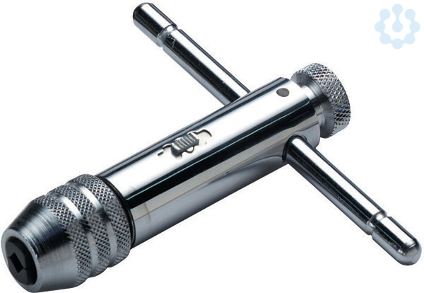 Eindrehwerkzeug für HSS-Gewindebohrer & Direktschneider mit Knarre für Rechts-und Linksgang, verchromt. Ausführung: Spannbereich: 4,6-8 mm; für Gewindebohrer DIN: M 5-12; ISO: M 6-12; Größe: 110