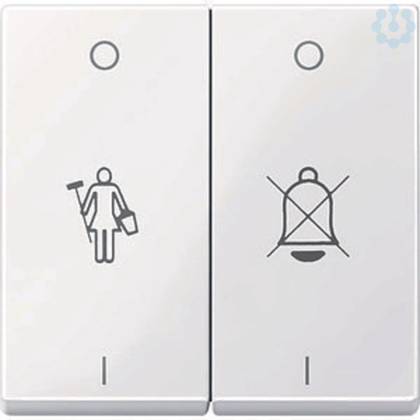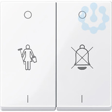 Wippe mit Aufdruck Klingel durchgestrichen/Zimmermädchen. Zu komplettieren mit Schalter und Taster, 2-fach. Material Thermoplast brillant, antibakteriell. Glatte und selbstdesinfizierende Oberfläche mit antibakterieller Wirkung. Farbe ähnlich RAL 9016. Farbe aktivweiß glänzend.