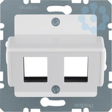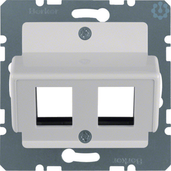 Zentralplatte 2f. f. Krone Modular Jacks Zentralplattensystem polarweiß, glänz..Zentralplatte 2-fach für Krone Modular Jacks, Cat.5 / Cat.5e/ Cat.6, Krone LWL-Kupplungen MT-RJ Jacks und 3M LWL-Kupplungen Volition. Mit Tragplatte, 30° Schrägauslass, ohne Spreizkrallen. Hinweis: Nur mit Zwischenring des Schalterprogramms zu verwenden. Beschriftungsfeld einrastbar in passenden Zwischenring.