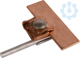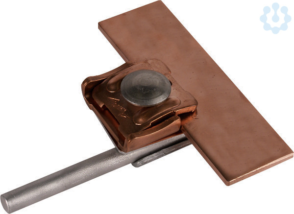 Falzklemme nach DIN EN 62561-1, zum Verbinden von Rundleitern mit Falzen. Ausführung Zweimetall für Falze Cu mit Zwischenplatte (Cupal), Leitungsführung längs oder quer.